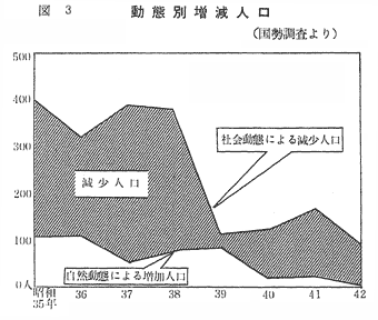 また、これと同時に、人口の地域的流動の激しさを表わしていることである。この流動による人口の社会的増減は、農山村から都会へと極端な過密地域を現出して、大きな国家的問題となっており、今後もこの傾向は更に強まるものと考えられる。