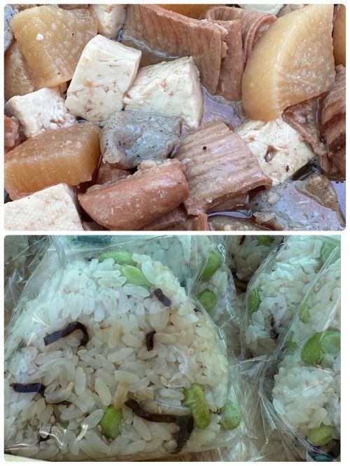 あけぼの大豆入り牛もつ煮、あけぼの大豆入りおにぎり、おいしそーーーー!!!