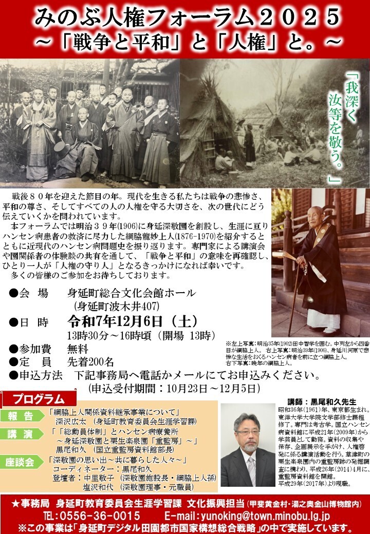 戦後80年を迎えた節目の年。現代を生きる私たちは戦争の悲惨さ、平和の尊さ、そしてすべての人の人権を守る大切さを、次の世代にどう伝えていくかを問われています。本フォーラムでは明治39年(1906)に身延深敬園を創設し、生涯に亘りハンセン病患者の救済に尽力した綱脇龍妙上人(1876-1970)を紹介するとともに近現代のハンセン病問題史を振り返ります。専門家による講演会や園関係者の体験談の共有を通して、「戦争と平和」の意味を再確認し、ひとり一人が「人権の守り人」となるきっかけになれば幸いです。多くの皆様のご参加をお待ちしております。