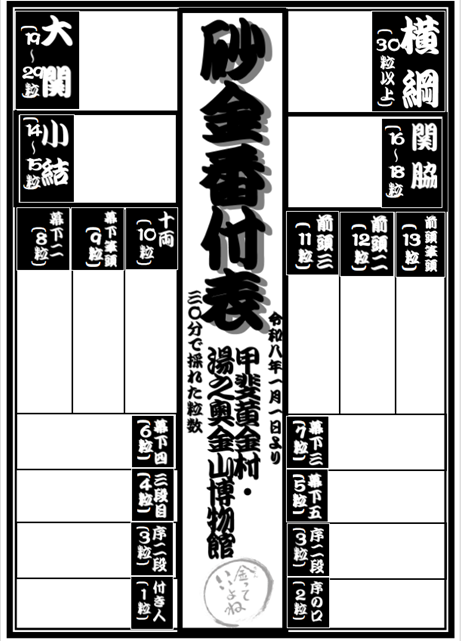 なお、現在の番付表にご掲載くださっている方々へ、令和8年度の1月ご掲載の方から順次移行できれば、、、と思っておりますが、これが完全アナログ作業でして・・・。もしも「自分もR8のお正月以降に掲載したので載せたいな」という方、誠にお手数をおかけしますが、砂金採りに足を運んでくれた時でも、メールでも、電話でもよいですので、スタッフにお気兼ねなくお伝えください。新番付表に掲載いたします。また旧番付表は当面の間、これまでどおり残りますのでご安心ください。