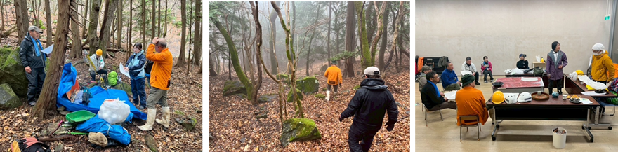 あまり人の入らない茅小屋金山跡には、シカの糞溜まりやスズメバチの巣の抜け殻なども存在していました。行く途中の斜面には鮮やかな紫紺のトリカブトの花が咲いており、枯木にはマスタケも秋を感じさせてくれます。今年はクマが里に下りてきて人間と遭遇する事例が特に多く、被害者や犠牲者迄も出ているというニュースや目撃映像がここのところ毎日報道されています。今頃は冬眠の準備の為食料をたくさん食べる時期ですが、今年はブナなどの木の実の不作が影響しているとのことで、身延町でもクマの目撃情報が度々町内放送されています。前回の茅小屋金山跡の現地調査に行くときにもクマが目撃されているため、爆竹を随所で鳴らしながら十分用心しての調査行きとなりました。林道脇にはクマの捕獲用の檻があり、クマらしき動物の糞もありました。まずは無事に帰還できてよかったです。午後は現地調査をもとに、調査検討委員会で調査の方向性と今後の計画について協議を行いました。