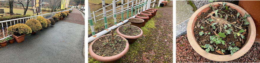 今年も黄金色の菊の花たちが博物館来館者を暖かく迎えてくれました。新年を迎えるにあたりこれらの鉢の菊が枯れてきたので、主幹を切り落として整理しました。花が終わった株の根元からは「冬至芽」と呼ばれる新芽がすでに出ており、来年の準備は万端のようです。今年株上げして並べた菊の株は、去年の菊の鉢から生じたこの「冬至芽」を畑に植え替えて養生して育てたもので、数はたくさんできましたが大きくて形の良い株はあまりできませんでした。黄色と赤色2色の菊があり、黄色のものは比較的強いのですが赤色の菊は除草作業で少し触れただけでもすぐに折れてしまい1鉢も鉢上げ迄には至りませんでした。そのため昨年度も株の提供をしていただいた山の仲間Aさんから、今年も菊の鉢を分けていただきました。ありがとうございます。20鉢以上も並べることができ、通路は賑やかで華やかになりました。