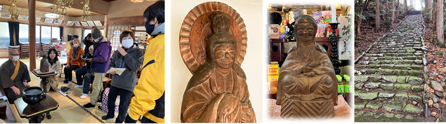 敬泉寺(きょうせんじ)の山号は迦葉山(かしょうさん)で、浄土宗の寺です。寺は中道往還沿いにありに迦葉坂、阿難坂や釈迦ガ岳など仏教にちなむ地名が残されています。本堂前には石臼がたくさん集積された石畳があり、鎌倉時代の木造阿弥陀如来立像も公開されていました。こちらの像は一部に截金文様がわずかに残り、胎内の阿弥陀経には正和4年(1315)と記されています。観音堂のある右左口宿は、徳川家康が甲斐入国の際に仮御殿を建てて滞在した所で、観音堂は家康来甲の折に府中を眺めた場所と伝える丘にあります。今回公開された観音像は、平安時代後期の作で桜材と思われる一木造、甲府市の指定文化財になっています。観音様のご尊顔を直接拝顔して、世界中の戦争がなくなり天下泰平になることとそれぞれの地域の平和安寧などを祈願してきました。